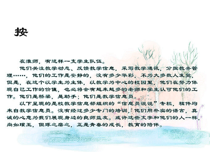 采访结束,但杨老师的一番话却深深地印在了我的脑海里,看着他诚挚的眼神,不需要更多的话语。就如杨老师所说,老老实实做人,认认真真做事,用自己对教育事业的爱书写艺术人生!
