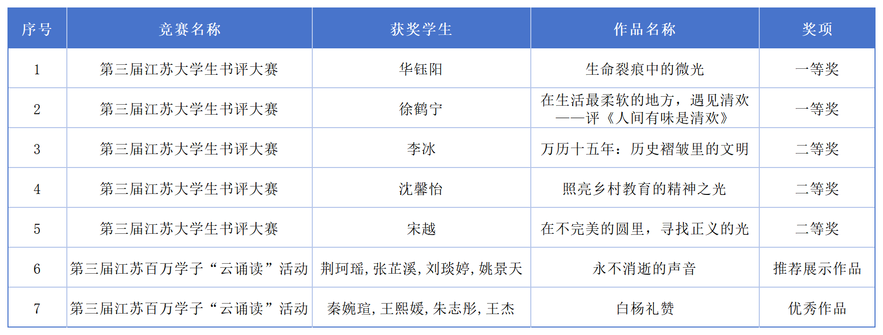 近日,第三届江苏大学生读书文化节在河海大学闭幕,会上宣布了读书文化节系列活动书评大赛和百万学子“云诵读”活动的获奖名单。书评大赛中,淮师地科院徐鹤宁、生科院华钰阳同学获得一等奖,历史学院沈馨怡、法学院宋越、历史学院李冰同学获得二等奖;百万学子“云诵读”活动中,新传学院荆珂瑶、张芷溪、刘琰婷、姚景天同学的作品《永不消逝的声音》被评选推荐展示作品,教科院秦婉瑄、王熙媛、朱志彤、地科院王杰同学的作品《白杨礼赞》被评为优秀作品。