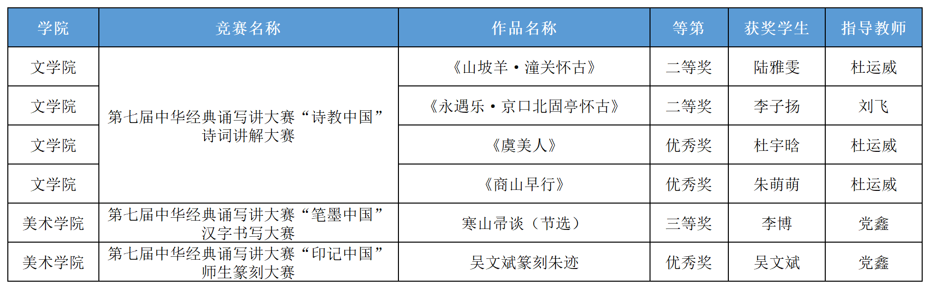 近日,由教育部、国家语言文字工作委员会主办的第七届中华经典诵写讲大赛获奖名单正式揭晓。我校学子凭借深厚的文化底蕴和出色的才华,在激烈的竞争中脱颖而出,共有6位同学荣获国家级奖项,取得了优异成绩。在“诗教中国”诗词讲解大赛中,文学院陆雅雯《山坡羊·潼关怀古》、李子扬《永遇乐·京口北固亭怀古》荣获全国决赛二等奖,文学院杜宇晗《虞美人》、朱萌萌《商山早行》荣获全国决赛优秀奖;在“笔墨中国”汉字书写大赛中,美术学院李博《寒山帚谈(节选)》获三等奖;在“印记中国”师生篆刻大赛中,美术学院吴文斌《吴文斌篆刻朱迹》获优秀奖。
