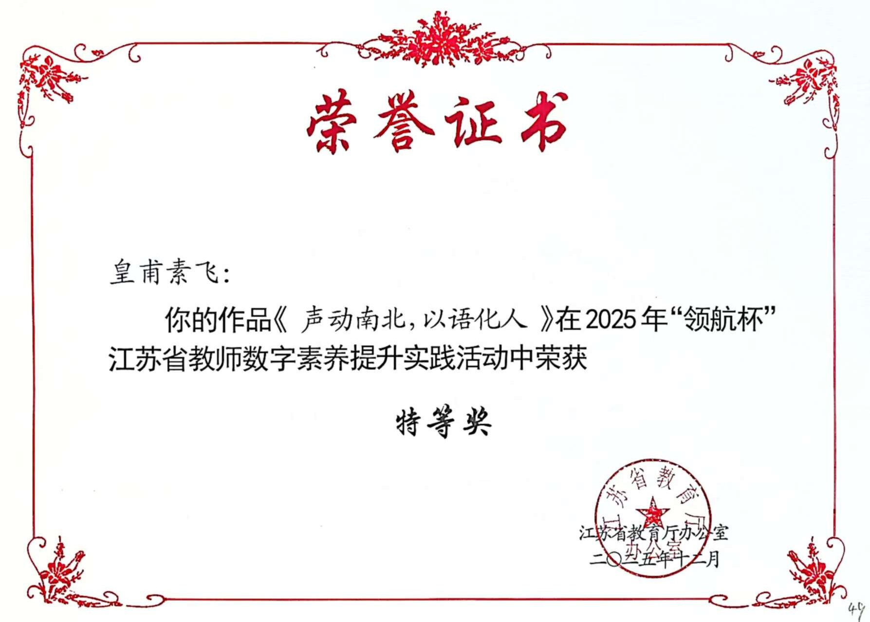 近日,由江苏省教育厅办公室举办的2025年“领航杯”江苏省教师数字素养提升实践活动获奖结果公布。在信息化教学课程案例项目中,文学院皇甫素飞老师荣获特等奖,化院王晓宇老师荣获一等奖,实现我校在该奖项上的新突破。